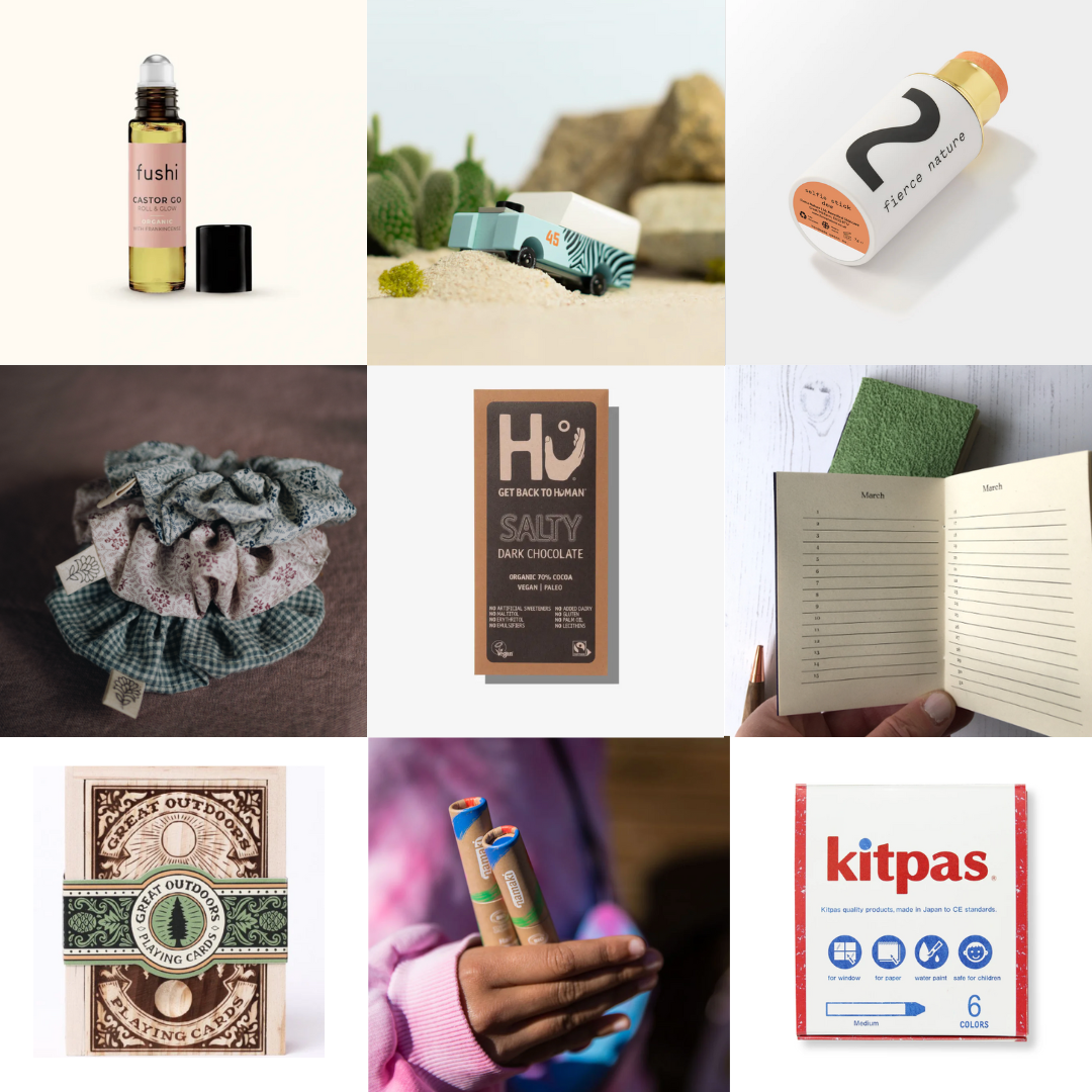 1 Fushi Castor oil and Frankincense Roller- £6 .2. Candy Lab Car - £9.95 3. Fierce Nature Selfie Stick (10% off with SLOWHOME10) £9.99 4. Flora Grace Hair Scrunchies- £6 5. Hu Salty Chocolate- £2.51 6. Etsy Birthday Book- £3.60 7. Great Outdoors Playing Cards- £13.99 8. Namaki Hair Mascaras- £12.50 9. Kitpas Window Crayons- £7.95
